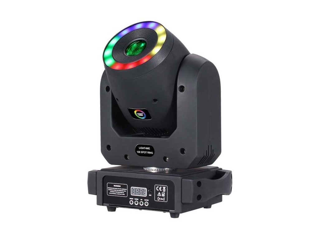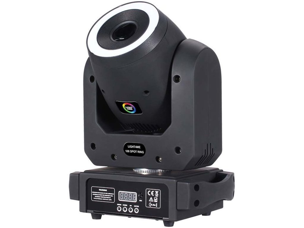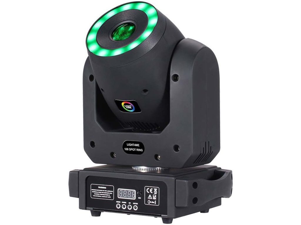 Light4Me 100 Spot Ring je pokročilá LED pohyblivá hlava typu spot, vybavená veľmi výkonnou 100 W bielou diódou a prídavným efektovým prstencom s 12x 0,3 W RGB diódami 3v1, ktoré obklopujú hlavnú šošovku. Vďaka kompaktnej konštrukcii a nízkej hmotnosti je hlava ľahko prenosná, takže sa výborne hodí pre pevné inštalácie aj mobilné použitie. Skvele funguje na koncertoch, predstaveniach, prehliadkach, v tanečných kluboch a na diskotékach aj ako osvetľovacie zariadenie pre mobilných DJ's.