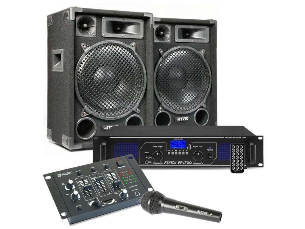 Výhodný set reproboxov Max MAX12 12" 700W, digitálneho zosilňovača Fenton FPL700 2x350W, mixpultu Vonyx STM-2211B, 2 dynamických mikrofónov Fenton DM100 (čierny) a prepojovacích káblov.
