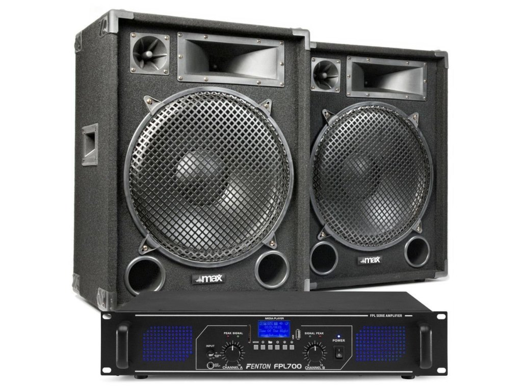 Výhodný set reproboxov Max MAX15 15" 1000W, digitálneho zosilňovača s Bluetooth a USB Fenton FPL700 2x350W a prepojovacích káblov.