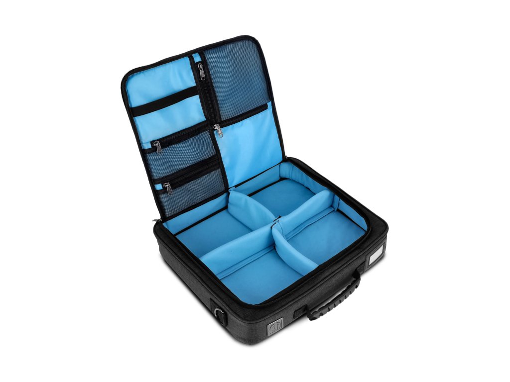 Tri flexibilné prepážky vo vnútri tašky sa dajú ľahko pripevniť na dno pomocou suchého zipsu. Vďaka tomu si môžete vnútorný priestor prispôsobiť presne podľa svojich potrieb. Ďalšie priehradky na zips v hornej časti a elastický popruh na zaistenie káblov z nej robia skutočne všestranného spoločníka.