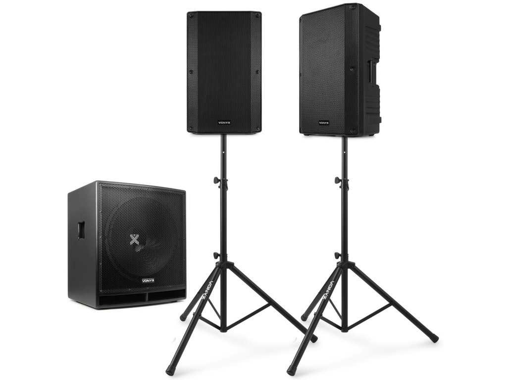 Výhodný set aktívneho subwoofera Vonyx SWP18 PRO 18" 1200W s 2 aktívnymi reproboxmi Vonyx VSA15 15" 1000W, sadou stojanov na reproboxy s prepravnou taškou Vonyx LS01K Kit a 2 káblemi Power Dynamics CX35-6 (6m).