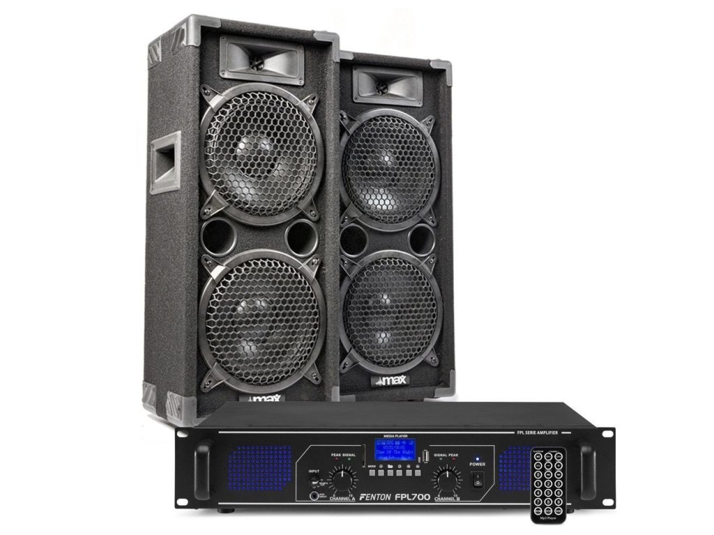 Výhodný set reproboxov Max MAX28 2x 8" 800W, digitálneho zosilňovača s Bluetooth a USB Fenton FPL700 2x350W a prepojovacích káblov.