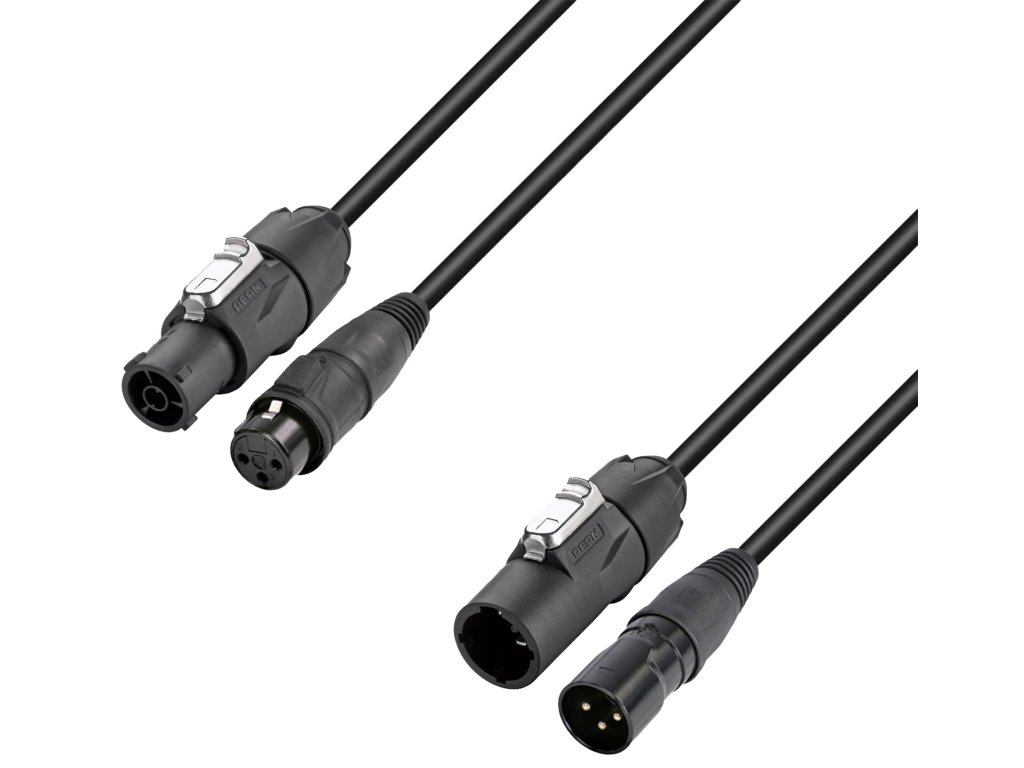 Kábel je vybavený originálnymi Rean® 3-pin XLR konektormi na prenos DMX signálu a robustnými napájacími konektormi Rean® X Series (kompatibilnými s Neutrik® TRUE1). Kábel je zapojiteľný pod záťažou, spĺňa štandardy a má certifikáciu IP65 - je vhodný pre vnútorné aj vonkajšie použitie. Oddelené prierezy vodičov zaisťujú stabilný a nerušený prenos: 2 × 0,22 mm² pre DMX a 3 × 1,5 mm² pre napájanie.
