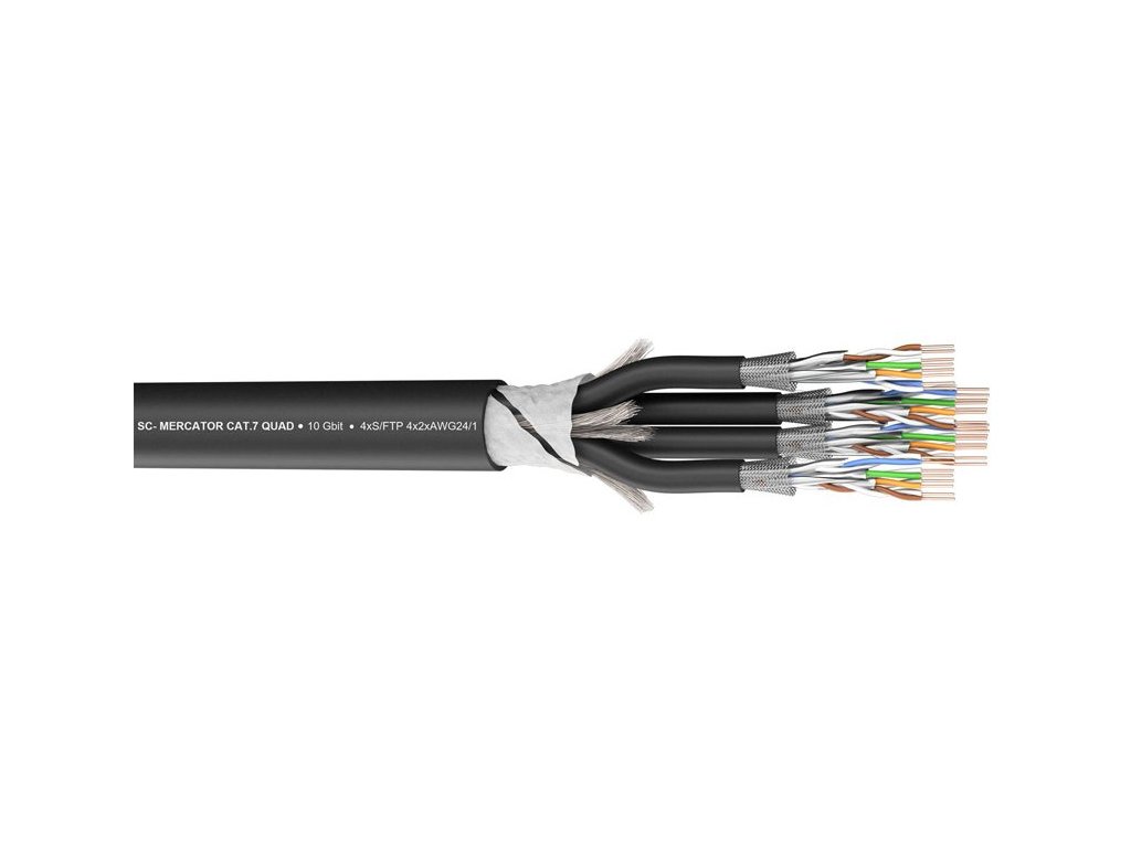 Multidátový kábel MERCATOR CAT.7 QUAD - 4 x samostatný kábel CAT.7 10 Gbit 4 x S/FTP 4 x 2 x 0,51 mm. Pocínované medené tienenie 100 %, odolnosť proti UV žiareniu, kapacita na 1 m 45 pF, hmotnosť 1 m 280 g, celkový priemer PVC 22,5 mm. Kábel je vhodný pre mobilné, štúdiové aplikácie a pevné inštalácie. Trieda CPR Fca.
