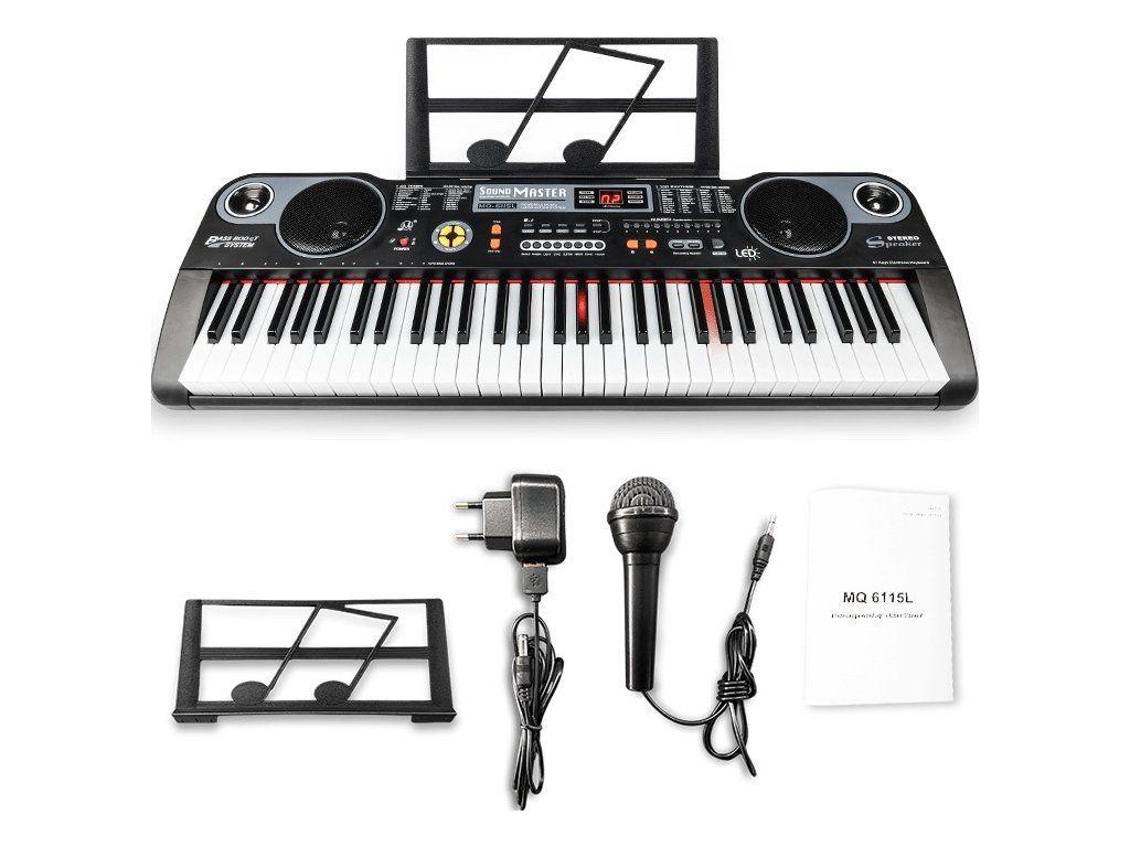 MQ 6115L je edukačný keyboard s mikrofónom pre deti so 61 klávesami, ktoré sú v režime lekcie podsvietené pre lepšiu orientáciu na klaviatúre. Je to nástroj vytvorený s ohľadom na výučbu hry a každodennú zábavu s hudbou. Veľmi rozsiahla banka zvukov, rytmov a široká paleta doplnkových funkcií robia z tohto nástroja pomocníka pri rozvíjaní hudobných záujmov a umožňujú spoznať bohatý svet zvukov.