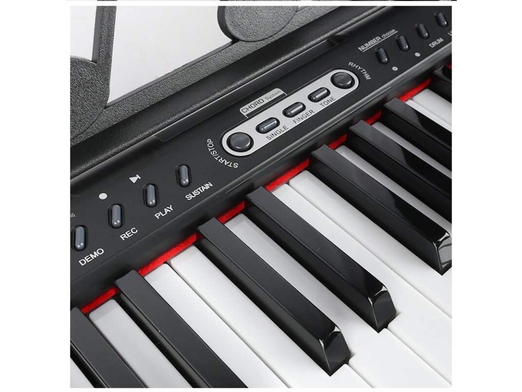 - Funkčné tlačidlá: Demo, Rec, Play, Prog, Start/Stop, Single, Finger, Tone, Rhythm, Number +/-, Drum, Light, Ensemble, Follow