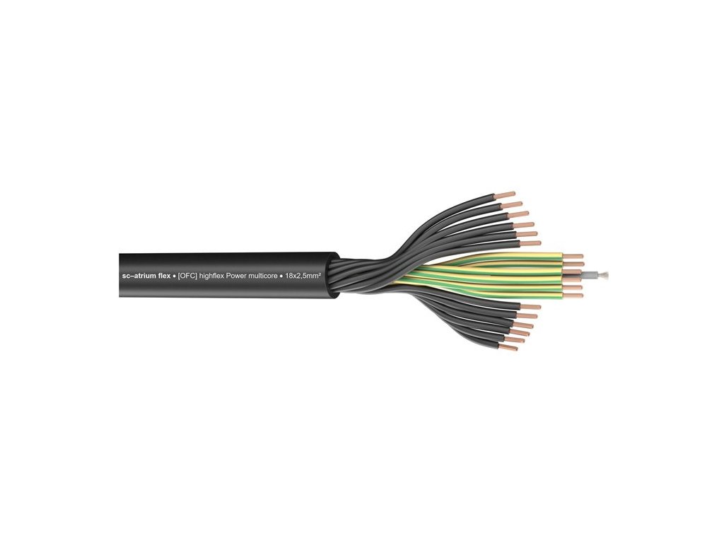 Atrium Flex viacpárový silový kábel, FLEX JZ 18 x 2,5 mm2, priemer gumovej izolácie 18,1 mm. Špeciálne ohybné a odolné S-PVC. Kábel je vhodný pre mobilné aplikácie a pevné inštalácie. Teplotný rozsah použitia -20° C - +70° C. Skúšobné napätie 4 kV. Vodiče sú očíslované, hmotnosť 1 m 630 g, farba čierna.