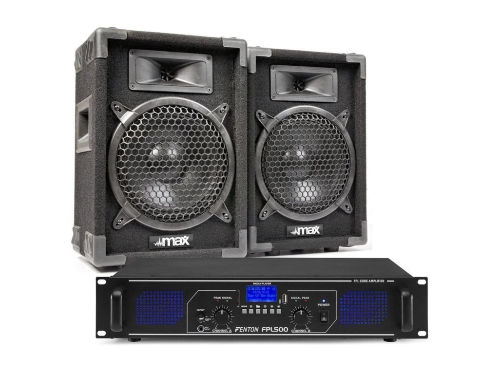Výhodný set reproboxov Max MAX8 8" 400W, digitálneho zosilňovača s Bluetooth a USB Fenton FPL500 2x250W a prepojovacích káblov.