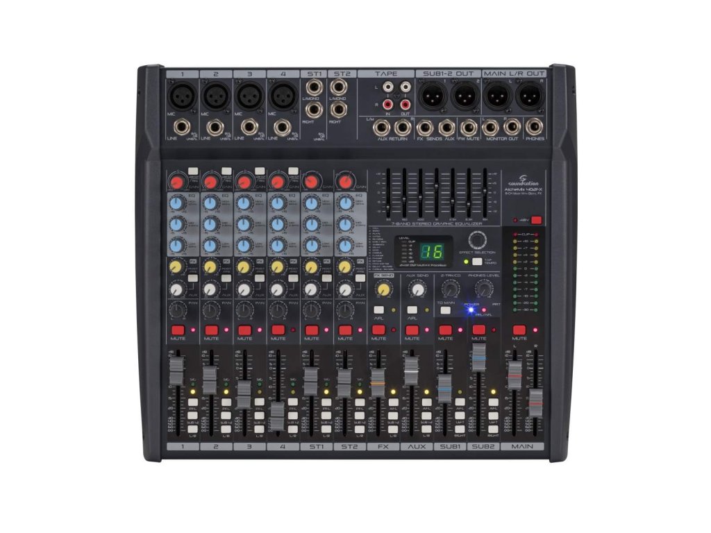 Alechmix 402FX je kompaktný profesionálny mixážny pult, ktorý disponuje odolnou a ľahkou konštrukciou pre ľahký transport. Osemkanálový pult ponúka štyri vstupy pre mikrofóny a hudobné nástroje s fantómovým napájaním, dva stereo vstupy pre klávesy a dvojicu vstupov pre hudobné prehrávače, tablety a DJ kontroléry. Pult ďalej disponuje šestnástimi efektmi s kvalitou 24bit/48kHz s Tap tempo tlačidlom, sedempásmovým grafickým ekvalizérom, trojpásmovým EQ pre inštrumentálne kanály, slúchadlovým výstupom a dvoma stereo XLR výstupmi pre pripojenie k ďalšiemu PA.