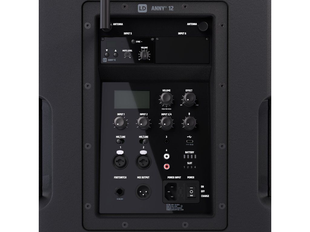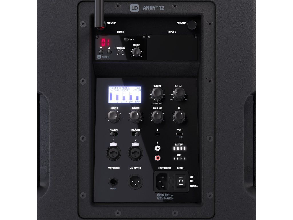 Integrovaný 6-kanálový mixážny pult, 3-pásmový ekvalizér, 5 predvolieb pre rôzne aplikácie (MUSIC, LIVE, VOCAL, ECO, FLAT) a efekty ako reverb a delay - tento reproduktor je skvelou kombináciou komplexných funkcií a vynikajúcej kvality zvuku v kompaktnom a robustnom prevedení. ANNY 12 zaujme svojimi všestrannými možnosťami pripojenia: dvoma combo vstupmi pre mikrofón/linku, jedným stereo kanálom s 3,5 mm jackom (AUX) a RCA vstupmi, a tiež Bluetooth 5.0 s kodekom AAC. Mobilné telefóny alebo tablety je možné nabíjať cez port USB-C na zadnej strane zariadenia ANNY, takže sú vždy pripravené na použitie.