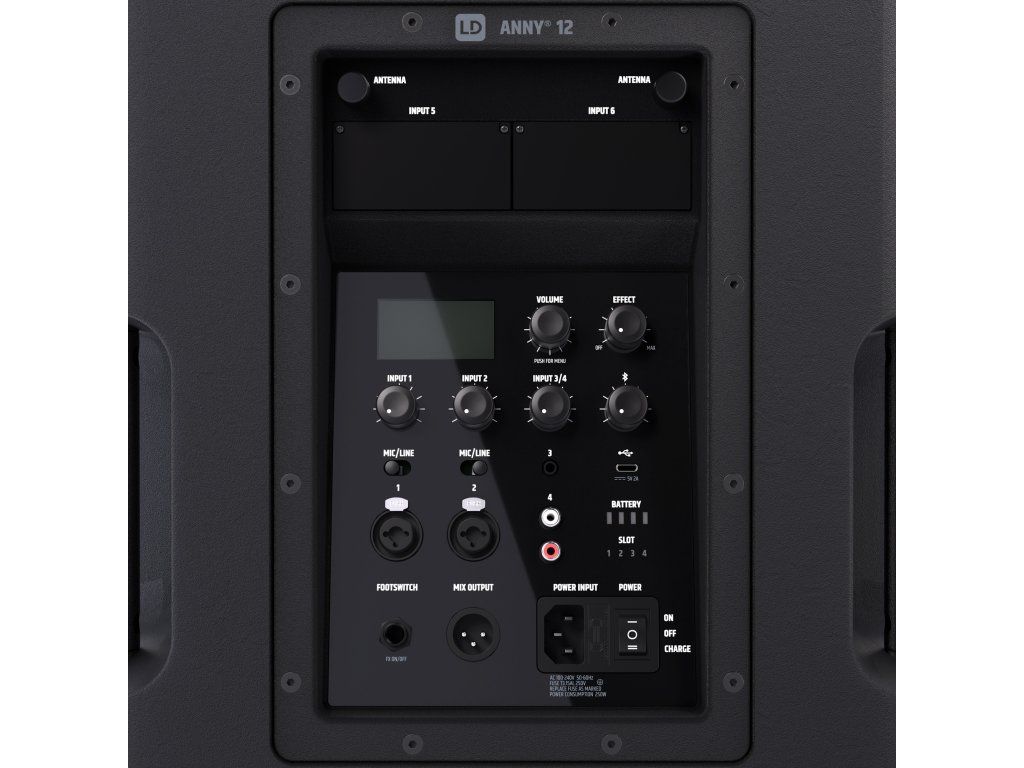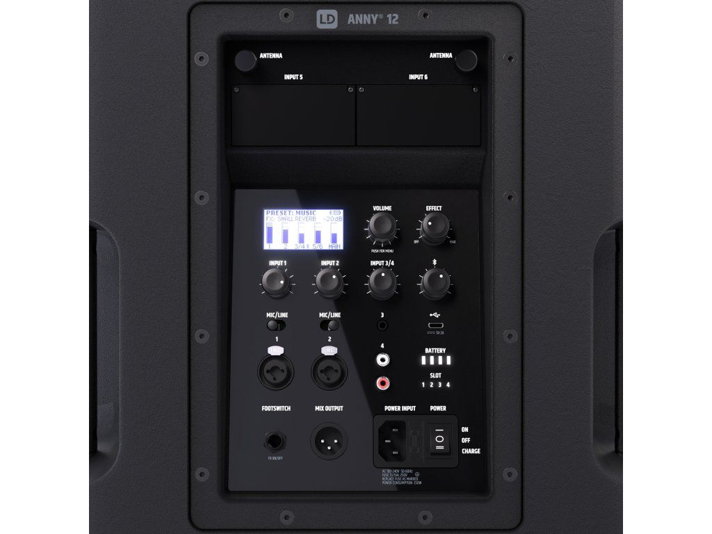 Integrovaný 6-kanálový mixážny pult, 3-pásmový ekvalizér, 5 predvolieb pre rôzne aplikácie (MUSIC, LIVE, VOCAL, ECO, FLAT) a efekty ako reverb a delay - tento reproduktor je skvelou kombináciou komplexných funkcií a vynikajúcej kvality zvuku v kompaktnom a robustnom prevedení. ANNY 12 zaujme svojimi všestrannými možnosťami pripojenia: dvoma combo vstupmi pre mikrofón/linku, jedným stereo kanálom s 3,5 mm jackom (AUX) a RCA vstupmi, a tiež Bluetooth 5.0 s kodekom AAC. Mobilné telefóny alebo tablety je možné nabíjať cez port USB-C na zadnej strane zariadenia ANNY, takže sú vždy pripravené na použitie.