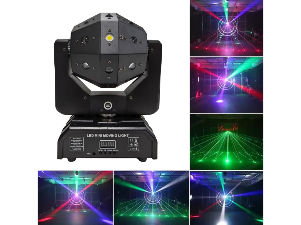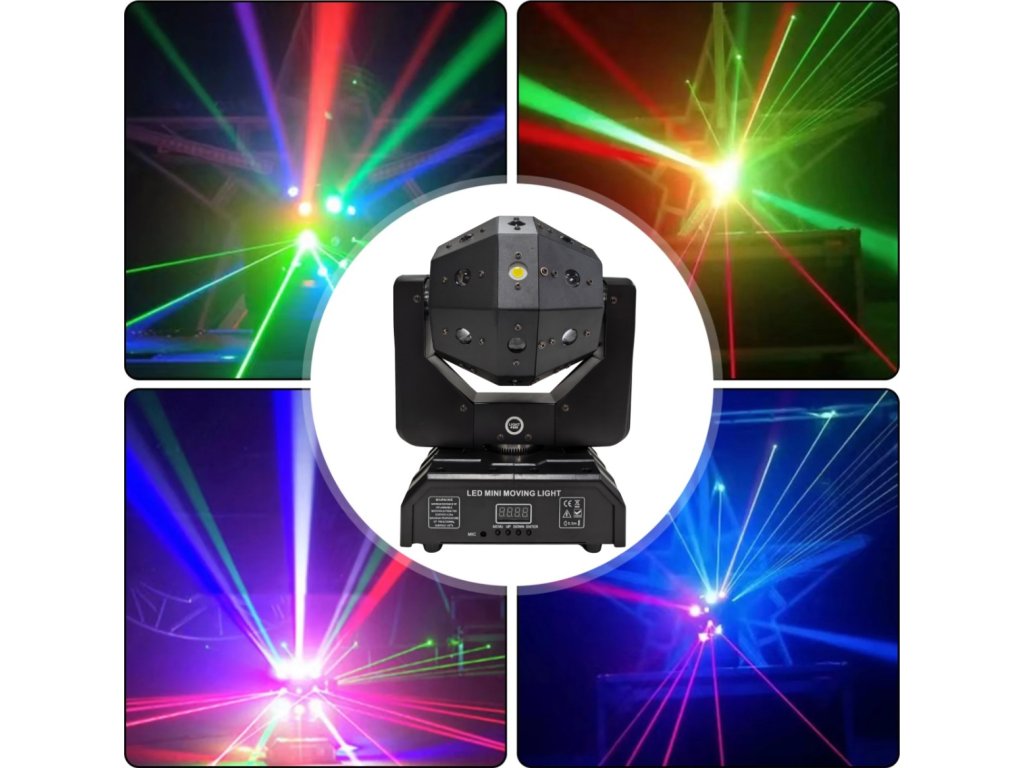 - Typ zariadenia: otočná multiefektová hlava 4v1 LED DMX beam, biely stroboskop, laser R/G s montážnymi držiakmi- Zdroj svetla: efekt beam: 16x3W R/G/B/W LED – 4xR, 4xG, 4xB, 4xW, efekt bieleho stroboskopu: 4x15W W LED, červený laser: 2x100 mW, zelený laser: 2x50 mW