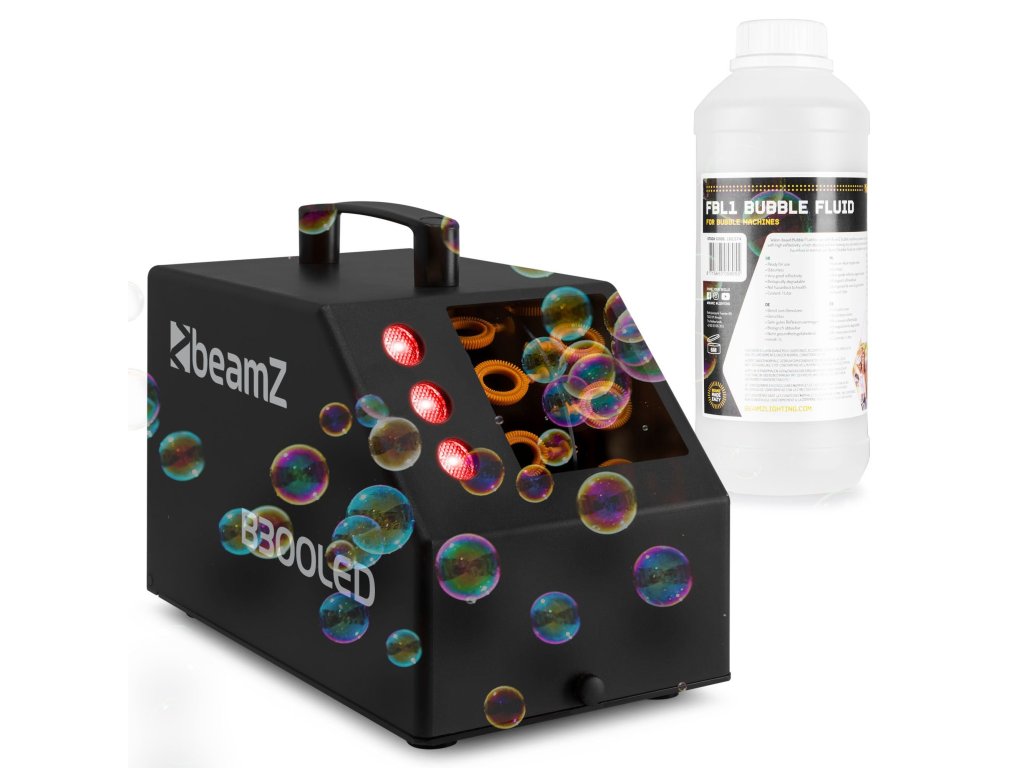 Výhodný set výrobníka bublín s LED RGB podsvietením BeamZ B300LED a kvapaliny na výrobu bublín BeamZ FBL1 1L.