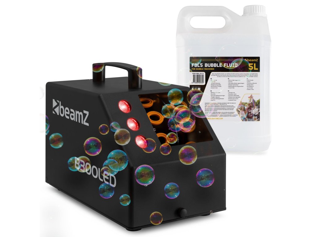 Výhodný set výrobníka bublín s LED RGB podsvietením BeamZ B300LED a kvapaliny na výrobu bublín BeamZ FBL5 5L.
