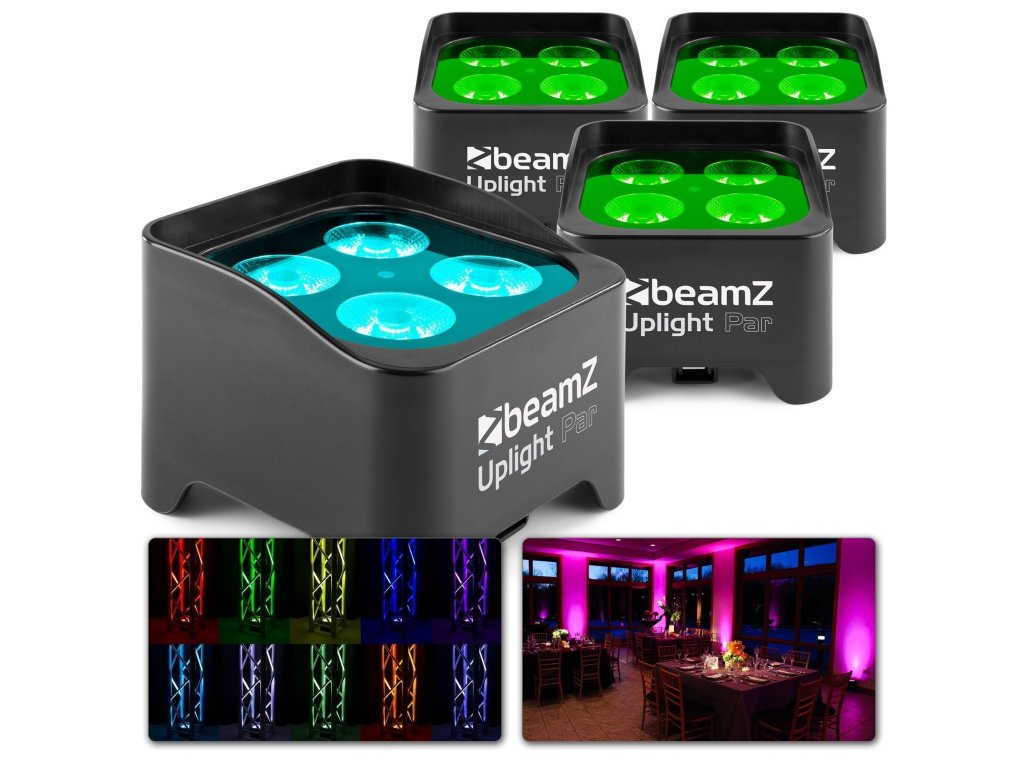 Výhodný set 4ks batériových LED svetiel s DMX a diaľkovým ovládaním BeamZ BBP90 Uplight Par 4x 4W RGB-UV.