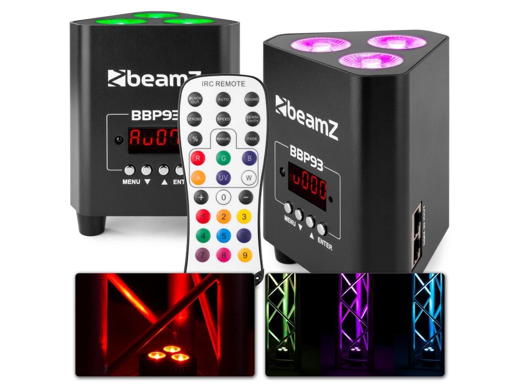 Výhodný set 2 batériových LED svetiel s DMX a IR diaľkovým ovládaním BeamZ BBP93 Uplight Par 3x 10W RGBW.