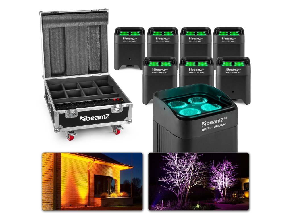 Výhodný set 8 batériových LED svetiel s bezdrôtovým DMX BeamZ BBP54 Uplight Par 4x 12W RGBAW-UV IP65 s prepravným kufrom s vstavaným dobíjaním BeamZ FCC10 Combi Charging Flightcase.