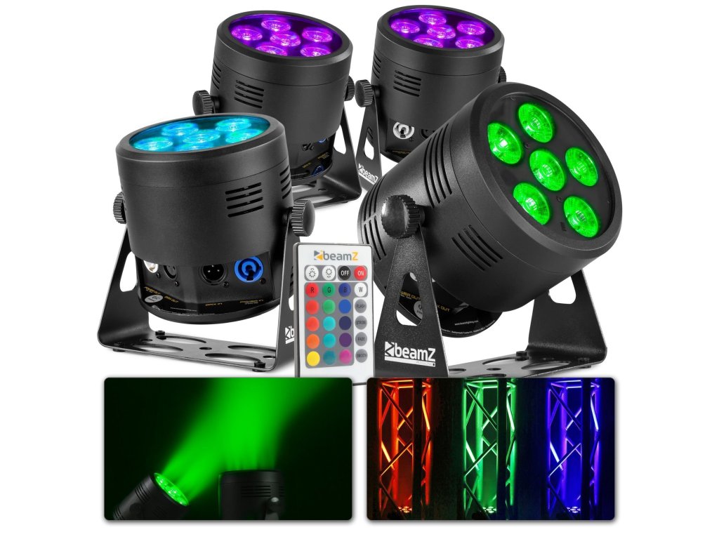 Výhodný set 4 batériových LED svetiel s DMX a IR diaľkovým ovládaním BeamZ BBP66 Uplight Par 6x 6W RGBW.