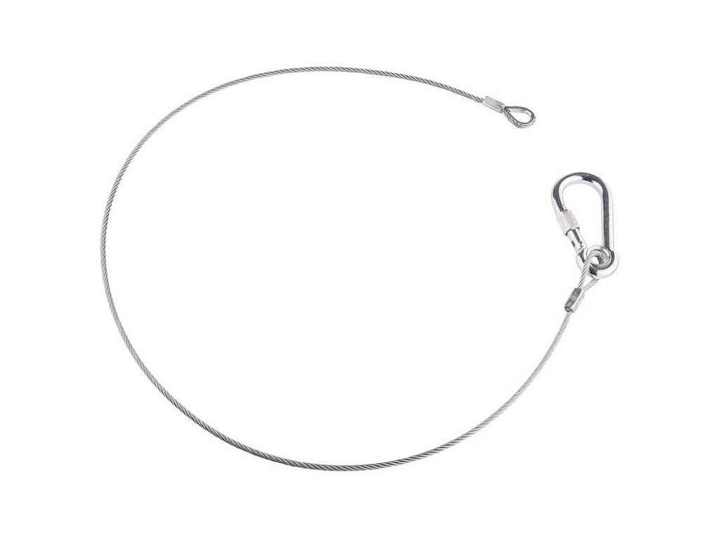 Bezpečnostné lanko s uzamykacou karabínou, bezpečné zaťaženie 50 kg pri správnom nastavení a statickom zaťažení, skvelé pre zabezpečenie svetiel nad hlavou na zostavách, nosníku a mriežkach. Priemer 5 mm, dĺžka 70 cm.