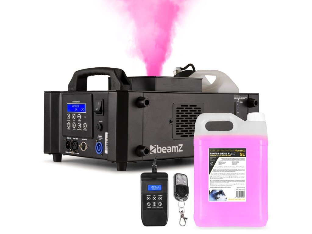 Výhodný set vertikálneho výrobníka hmly s bezdrôtovým diaľkovým ovládačom a LED podsvietením BeamZ BLAZE1200 1200W a kvapaliny vysokej hustoty BeamZ FSMF5H 5L.