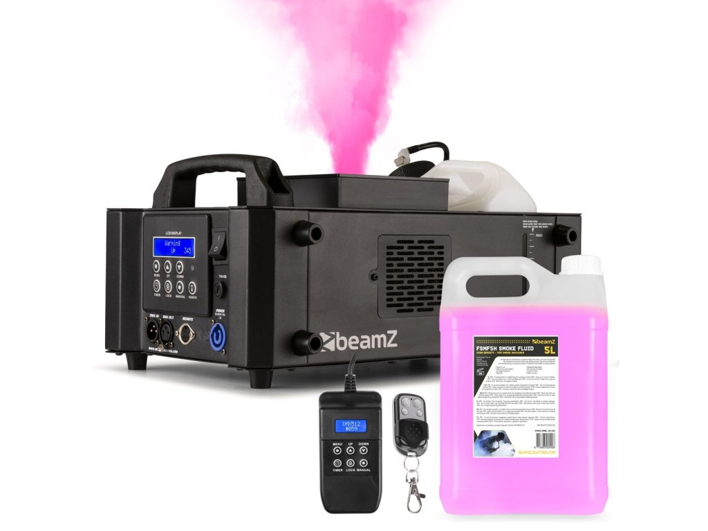 Výhodný set vertikálneho výrobníka hmly s bezdrôtovým diaľkovým ovládačom a LED podsvietením BeamZ BLAZE800 800W a kvapaliny vysokej hustoty BeamZ FSMF5H 5L.