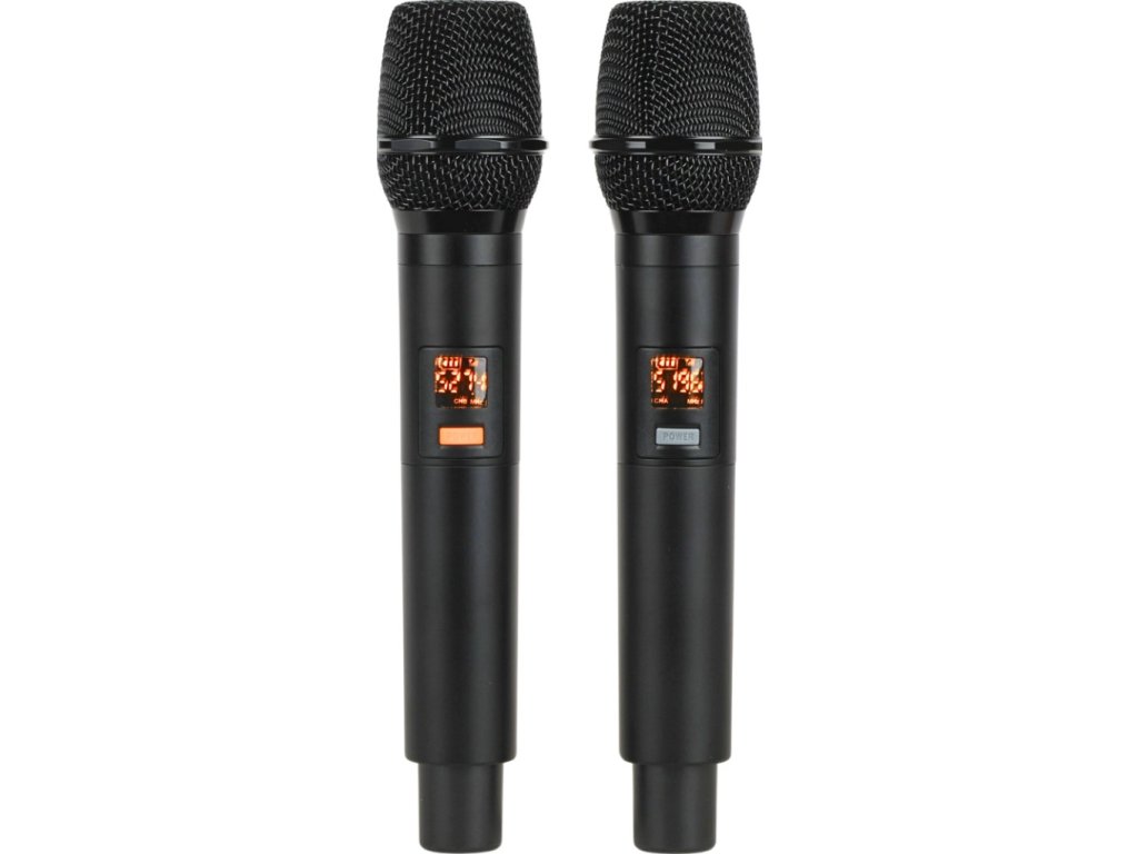 Bezdrôtové mikrofóny: frekvenčný rozsah: UHF 518–542 MHz, typ: ručný, dynamický, napájanie: 2 batérie AA (súčasťou balenia), vypínač napájania: áno, displej: LED
