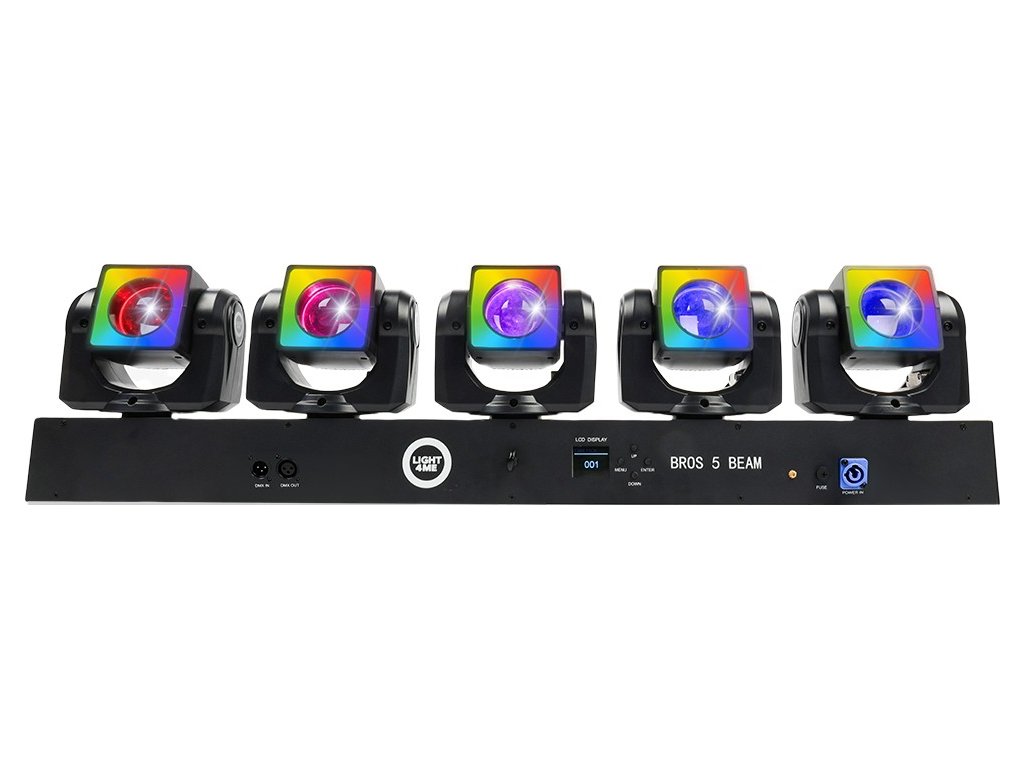 Light4me Bros 5 Beam je profesionálny LED svetelný efekt, ktorého svetelným zdrojom je 5 pohyblivých hláv. Každá z nich je vybavená hlavnými RGBW diódami s výkonom 40 wattov a 24 RGB diódami s výkonom 0,2 W pre efekty pozadia! Prácu každej z hláv, vrátane efektov hlavných diód a efektov pozadia, je možné ovládať samostatne pomocou protokolu DMX (Pixel Control). LED osvetlenie skvele funguje na hudobných pódiách, pri predstaveniach a šou, v tanečných kluboch a diskotékach, a tiež ako dynamické osvetlenie pre svadobné kapely a mobilných DJov.