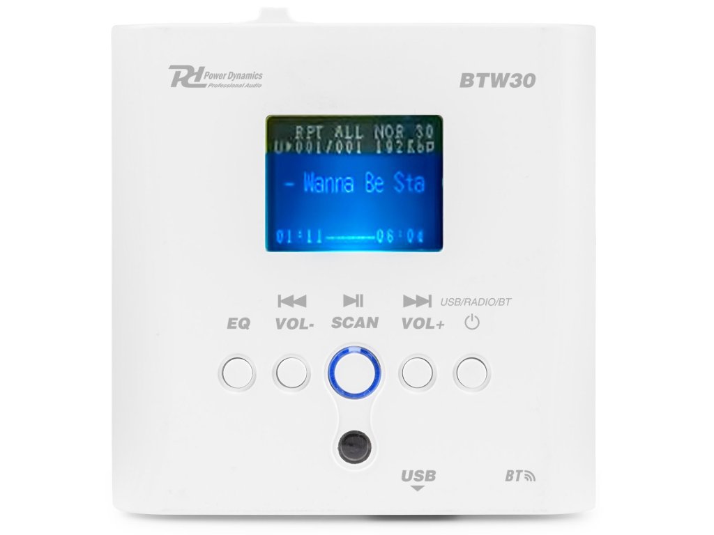 BTW30 nástenný audio systém pridáva pohodlné BT audio streamovanie a ovládanie tam, kde ho potrebujete. Tento kompaktný zvukový ovládač s digitálnym zosilňovačom 2x 15 W je vybavený vstavaným USB audio prehrávačom, FM tunerom a BT prijímačom, ktorý je možné pripojiť k väčšine smartfónov / tabletov, ktoré majú pripojenie BT. Jednotku je možné tiež ovládať pomocou priloženého diaľkového ovládača. BTW30 je kompletné a všestranné zvukové riešenie pre nástenné alebo stropné reproduktory na pozadí v domácich alebo komerčných priestoroch.