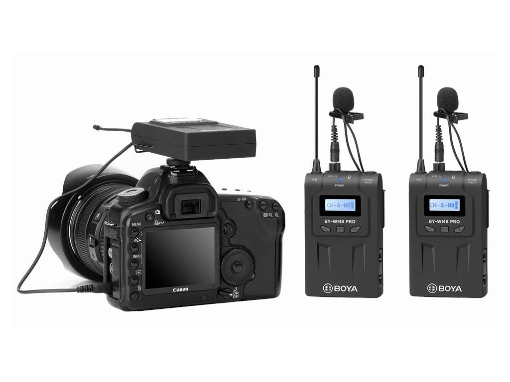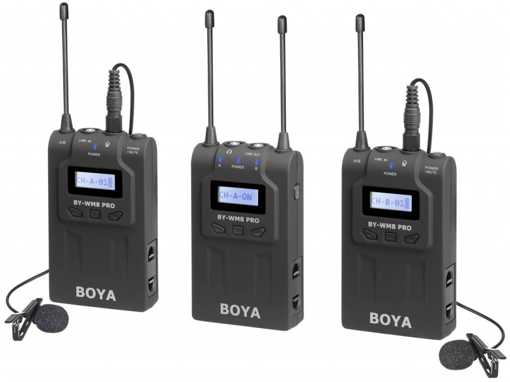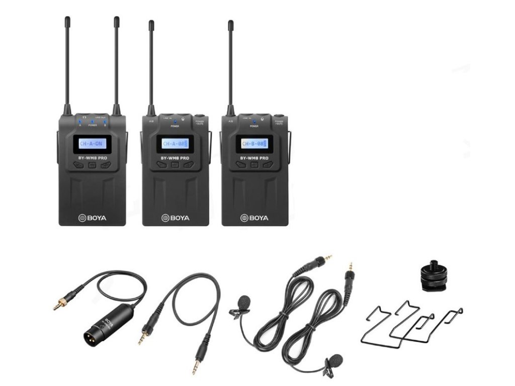 Bezdrôtový mikrofónny UHF systém Boya BY-VM8 Pro K2 využíva 48 kanálov v 2 skupinách a elektronické ladenie kmitočtu pomocou PLL syntetizátora. Skladá sa z 2 vysielačov TX8 Pro, z prijímača RX8 Pro a z 2 lavalierových mikrofónov s omnidirekcionálnym polárnym vzorom, ktorý prijíma zvuk rovnako kvalitne a s rovnakým ziskom zo všetkých strán, takže snímaný hlas znie stále čisto a prirodzene.