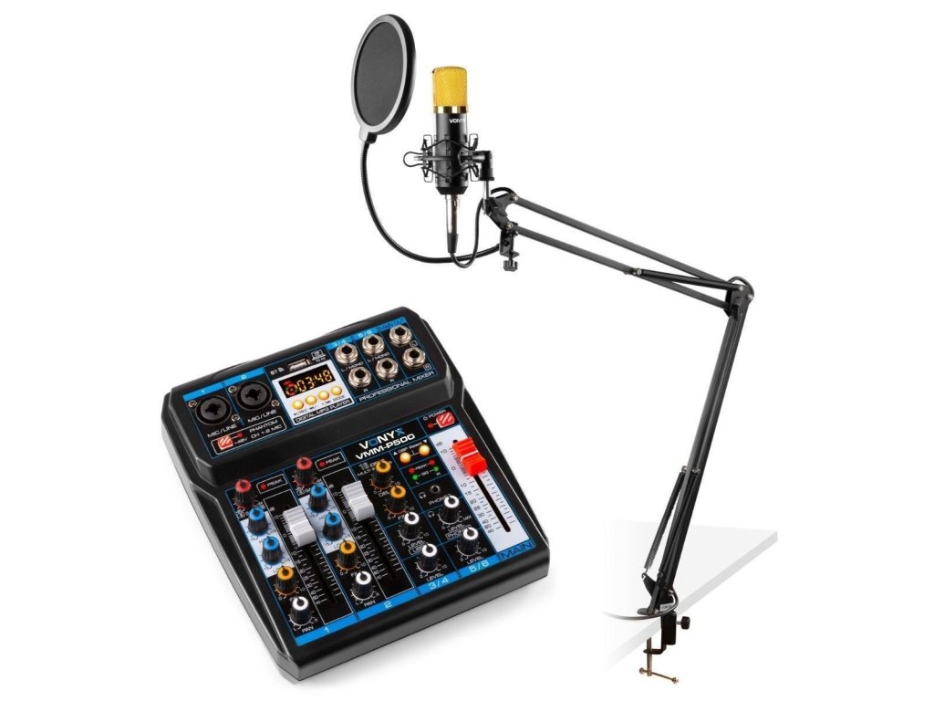 Výhodný set štúdiového kondenzátorového mikrofónu so stojanom a popfiltrom Vonyx CMS400B (zlatý) a mixážneho pultu s DSP, Bluetooth a USB Vonyx VMM-P500.