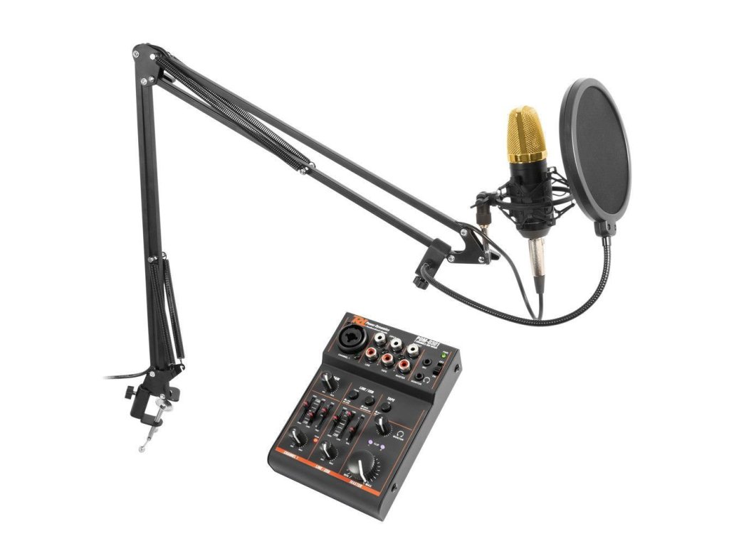 Výhodný set štúdiového kondenzátorového mikrofónu s nastaviteľným ramenom a pop filtrom Vonyx CMS400 Studio Set a mixpultu s USB Power Dynamics PDM-D301.