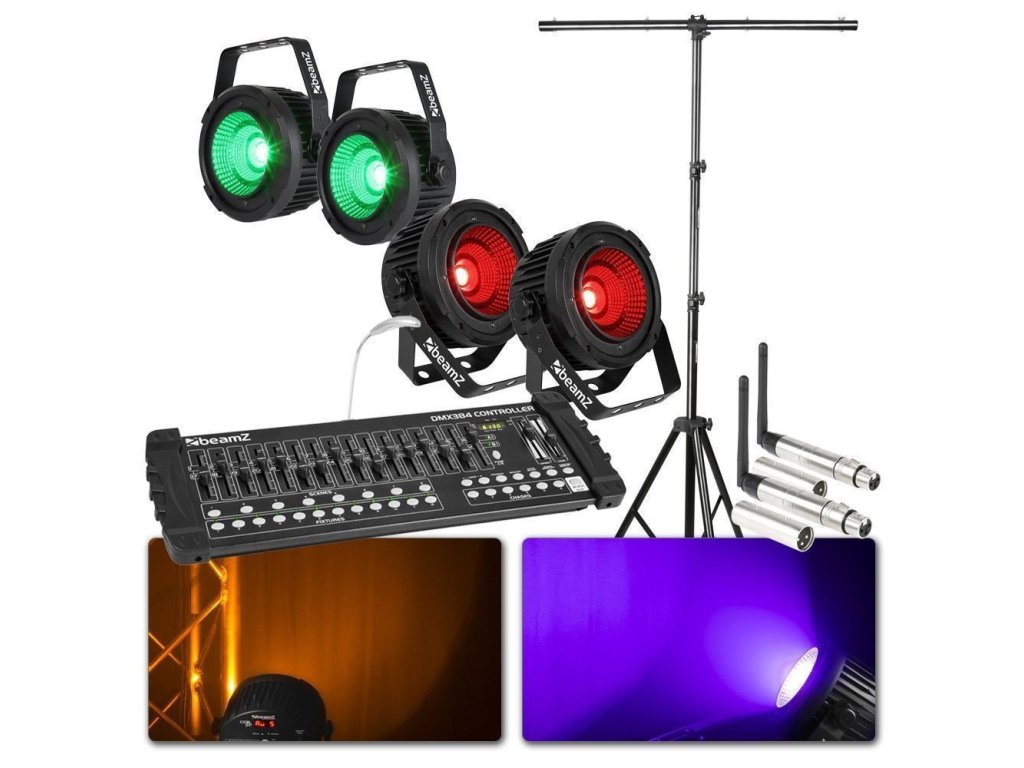 Výhodný set 4 LED PAR reflektorov BeamZ COB50 s ovládacím pultom BeamZ DMX 384, 2 bezdrôtovými vysielačmi/prijímačmi BeamZ BBP Wireless, 3 DMX káble Power Dynamics CX100-0,7 0,75m a svetelným statívom LS30T 3,5 m 25kg T-bar.