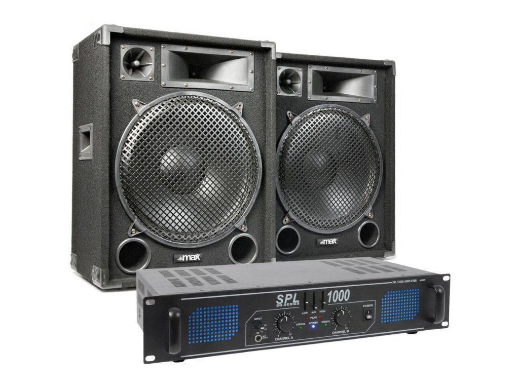 Výhodný set 2 reproboxov Max MAX15 15" 1000W, zosilňovača Skytec SPL 1000 2x500W a reproduktorového kábla Power Dynamics RX32 10m.