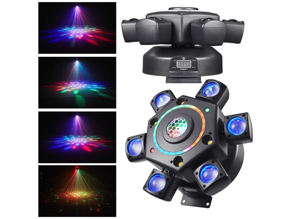 - Typ zariadenia: 7v1 LED DMX lúč, kaleido/gobo krúžok, multiefekt, biely/zlatý stroboskop, RGBW laser s montážnym držiakom.