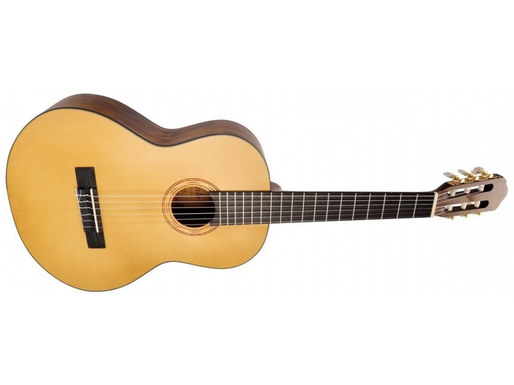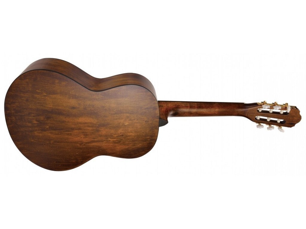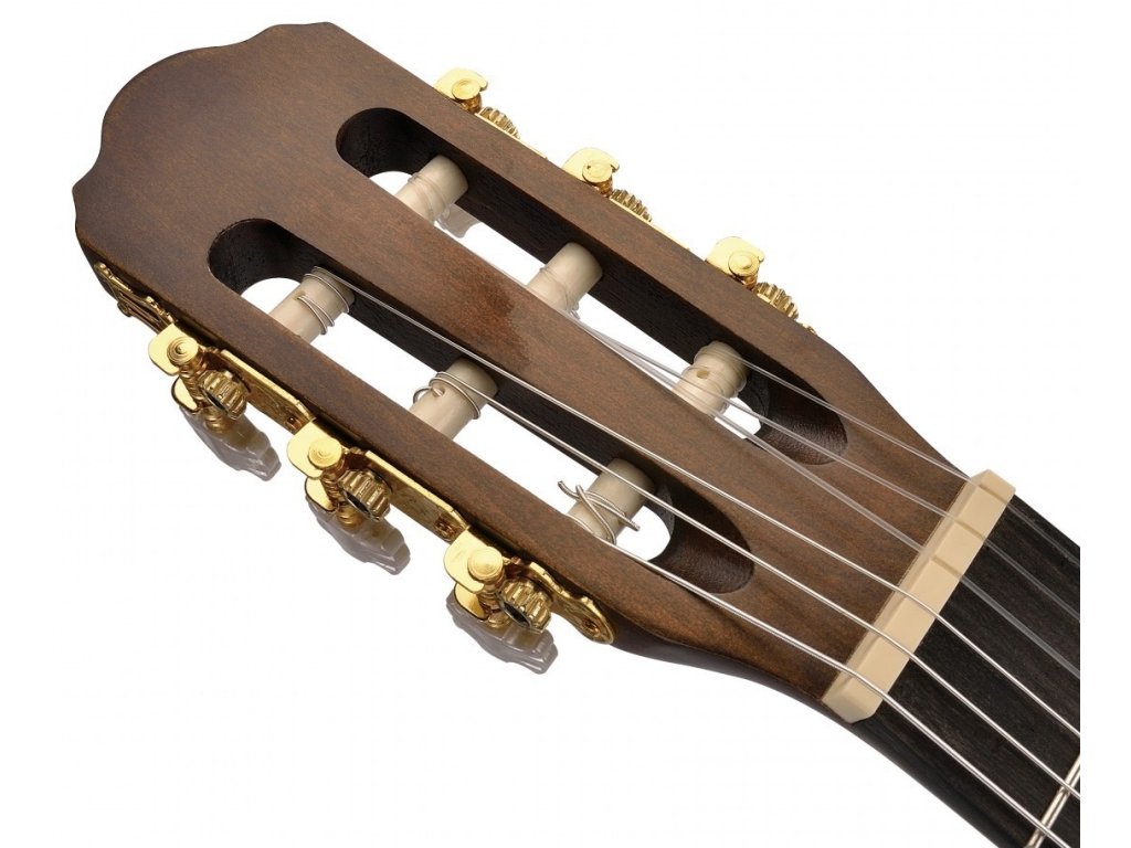 Gitara je vybavená spoľahlivými klasickými ladiacimi mechanikami v zlatom vyhotovení a palisandrovou kobylkou, ktoré udržujú stabilné ladenie. Štýlové spracovanie dopĺňa matný lak na vrchnej doske, ručne nanášaný lak na zadnej doske a luboch a elegantná čierna obvodová lemovka, ktorá podčiarkuje jej vzhľad.