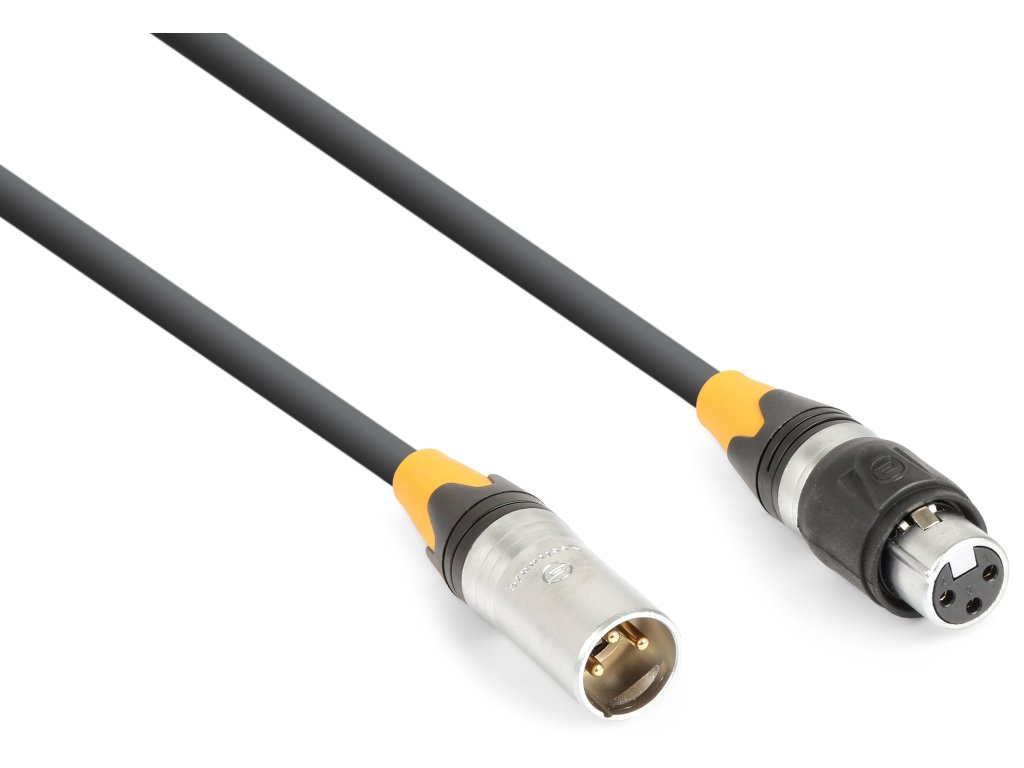 Profesionálny DMX kábel odolný voči prachu a vode (IP65), dĺžka 12m. Je vybavený vysoko kvalitnými kovovými konektormi 3-pin XLR (M) - 3-pin XLR (F) zaručujúcimi bezproblémový a spoľahlivý prenos DMX signálu. Súčasťou je sťahovacia páska.