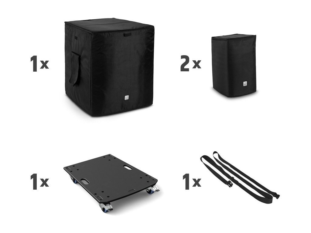 Táto sada obsahuje všetko, čo potrebujete na bezpečnú a jednoduchú prepravu vášho systému DAVE 18 G4X. Súčasťou je roller board, ochranný obal subwoofera, dva satelitné ochranné obaly a napínací popruh. Všetko príslušenstvo je dokonale prispôsobené systému DAVE 18 G4X.