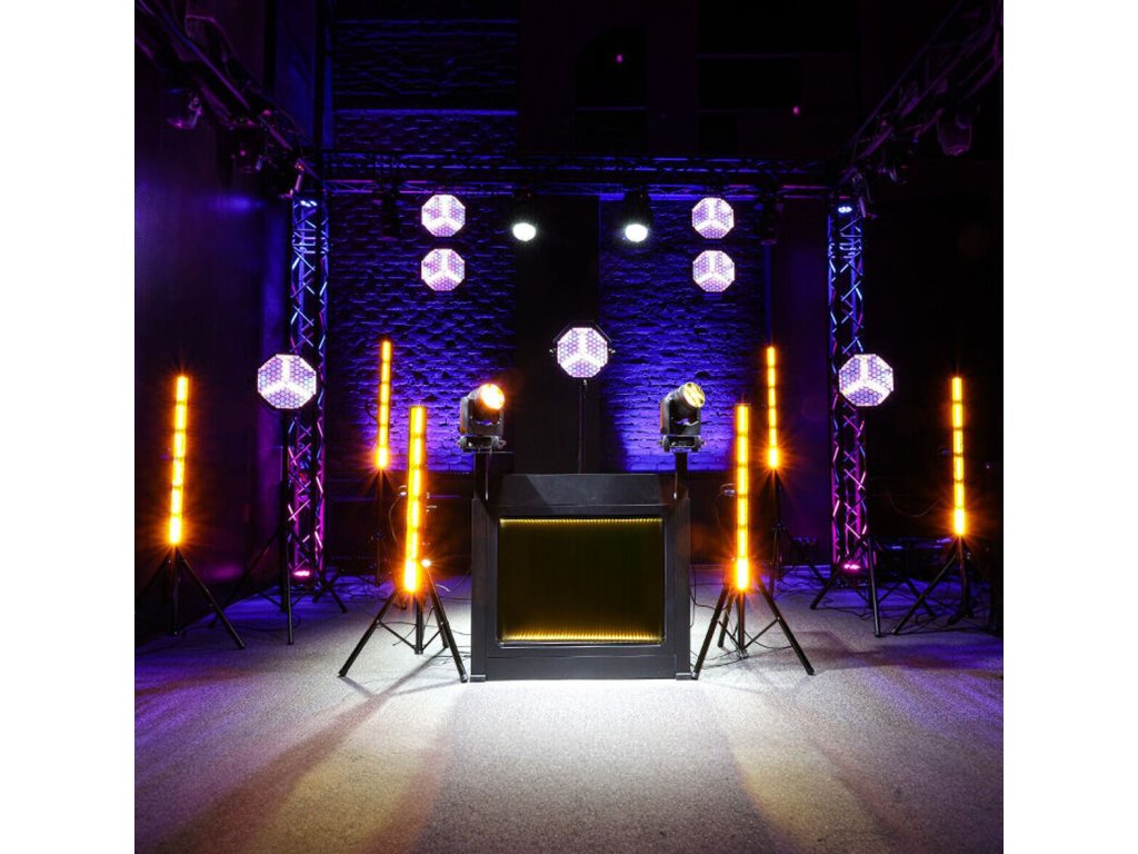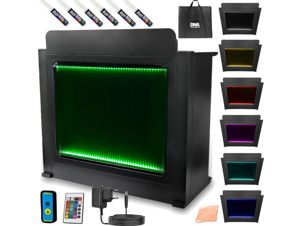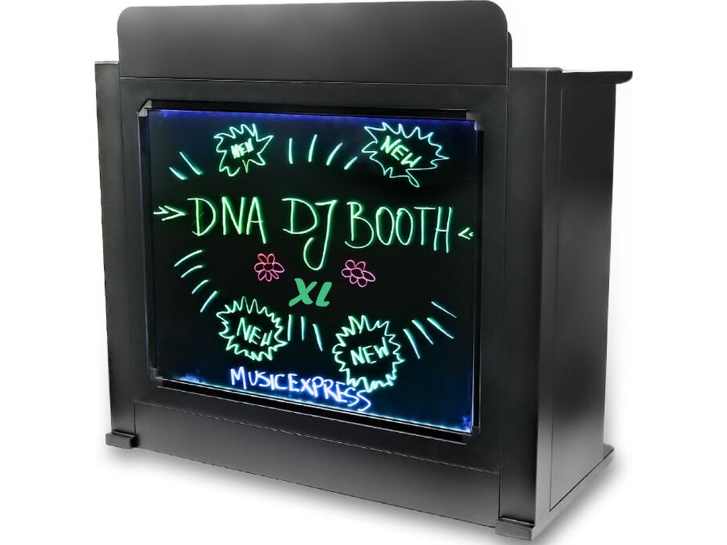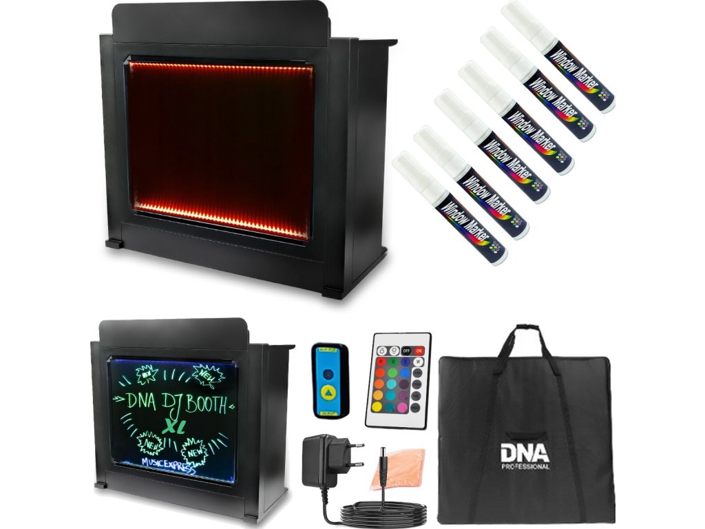 DNA DJ BOOTH XL BK je stabilná kovová konštrukcia v čiernej farbe, vybavená špeciálnym podsvieteným panelom, na ktorý môžete kresliť ľubovoľné tvary a nápisy pomocou priložených fluorescenčných fixiek. Dôležitou súčasťou je tiež veľká, odnímateľná pracovná doska s rozmermi 120 x 49,5 cm umiestnená vo výške 93 cm. Je to skvelý spôsob, ako na jeden kompaktný priestor umiestniť mixážny pult s príslušenstvom, notebook a ďalšie doplnky. Vďaka tomu je DNA DJ BOOTH XL BK skvelým riešením pre každého, kto pri svojich vystúpeniach používa rôzne DJ mixy, prehrávače, loopery, audio efekty alebo dokonca syntetizátory a kontroléry. V doske nájdete špeciálny otvor na káble, ktorý umožňuje ich pohodlné usporiadanie a zabraňuje ich zamotaniu. Navyše je súčasťou sady aj dedikovaný obal vyrobený z najkvalitnejšieho materiálu, ktorý uľahčuje pohodlnú prepravu a skladovanie.