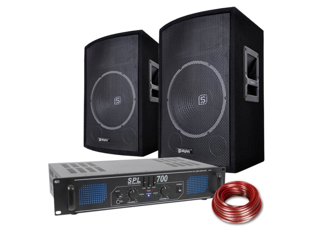Výhodný set 2 reproduktorov Vonyx SL12 Disco speaker 12" 600W, zosilňovača Skytec SPL 700 2x350W a reproduktorového kábla Power Dynamics RX32 10m.