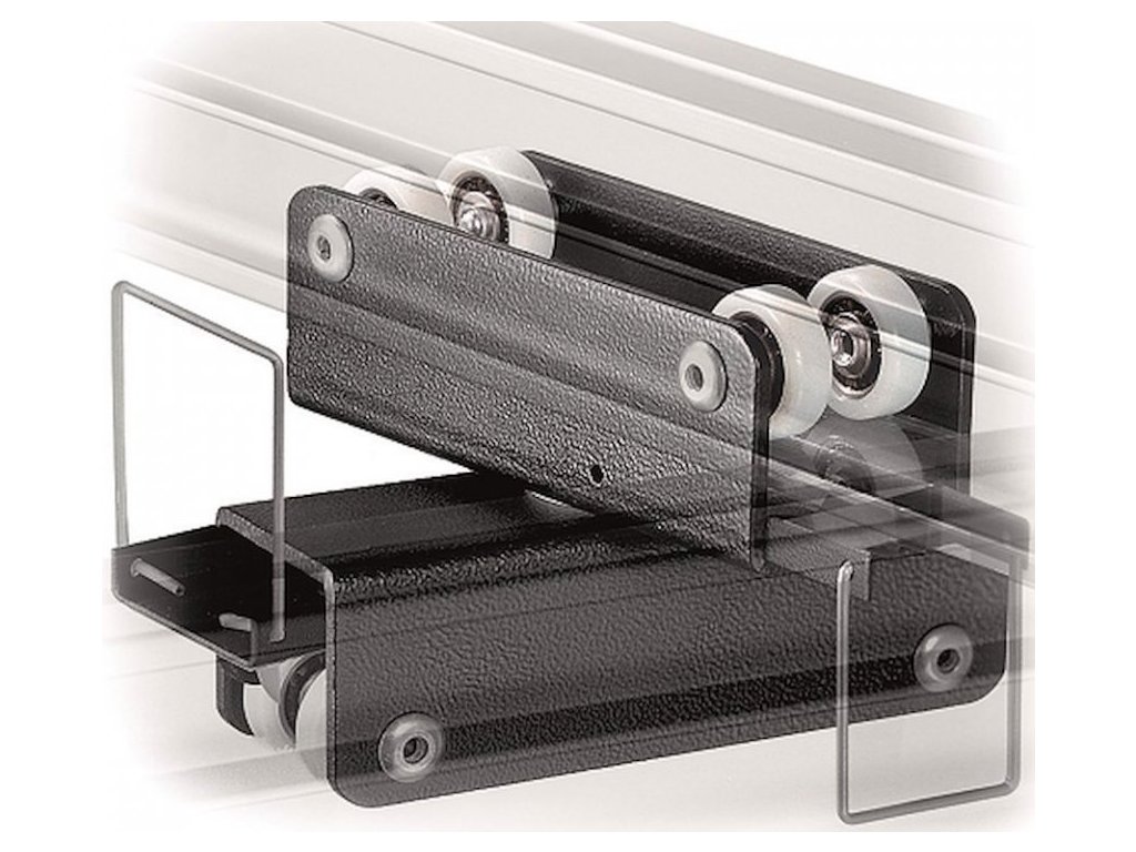 Dvojitý posuvný vozík s dvojitou brzdou na hornom aj spodnom vozíku. Horná brzda blokuje vozík na pevnej koľajnici, zatiaľ čo brzda spodného vozíka blokuje posuv pohyblivej koľajnice.