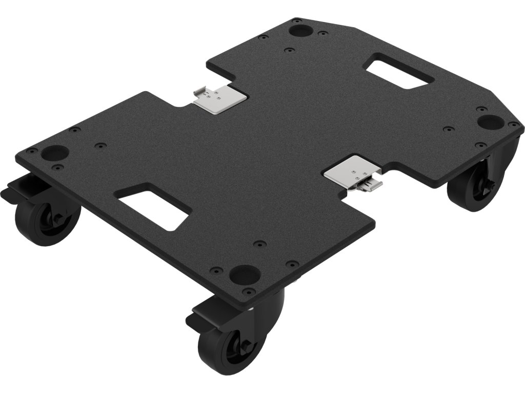 Doska vozíka je vybavená dvoma motýlikovými otočnými západkami, ktorými sa bezpečne pripevní k záchytným plochám na spodnej strane subwoofera. Vozík je vybavený štyrmi záťažovými kolieskami (2 s brzdou) a jeho celková nosnosť je 62,5 kg. To znamená, že unesie váhu celého systému EVOLVE 70, čo umožňuje bezpečnú montáž a prevádzku systému po presunutí na miesto a zaistenie zámkov koliesok.
