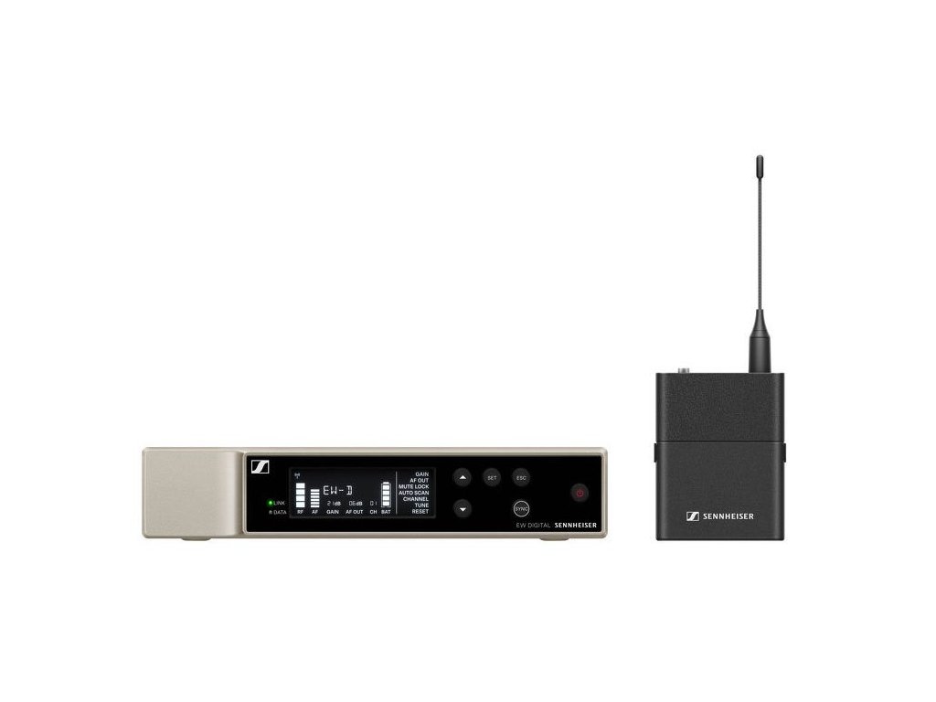 EW-D SK Base Set je bezdrôtová digitálna mikrofónna sada rackového prijímača a bodypack vysielača. K vysielaču môžete pripojiť akýkoľvek klopový alebo hlavový mikrofón Sennheiser s konektorom jack 3,5 EW alebo nástrojový kábel na pripojenie ku gitare alebo klávesom. Pomocou prepínača MUTE na vysielači môžete signál v prípade potreby vypnúť (stlmiť). Na vysielači nie sú okrem zapínania žiadne ďalšie ovládacie prvky, všetky parametre sa nastavujú na prijímači alebo z mobilu či tabletu v aplikácii Smart Assist.