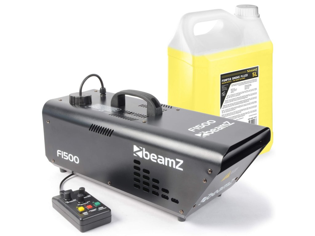 Výhodný set fazer výrobníka hmly BeamZ F1500 Fazer DMX 1500W a kvapaliny strednej hustoty BeamZ FSMF5S 5L.