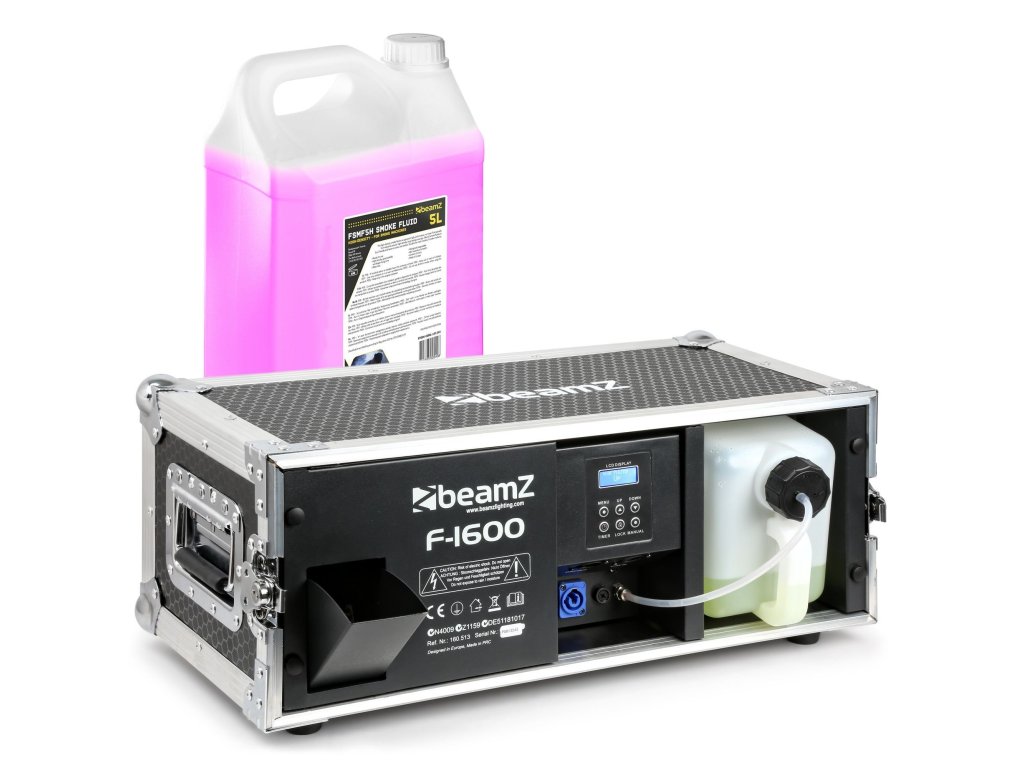 Výhodný set fazer výrobníka hmly v prepravnom kufri BeamZ F1600 Pro Faze 1600W a kvapaliny vysokej hustoty BeamZ FSMF5H 5L.