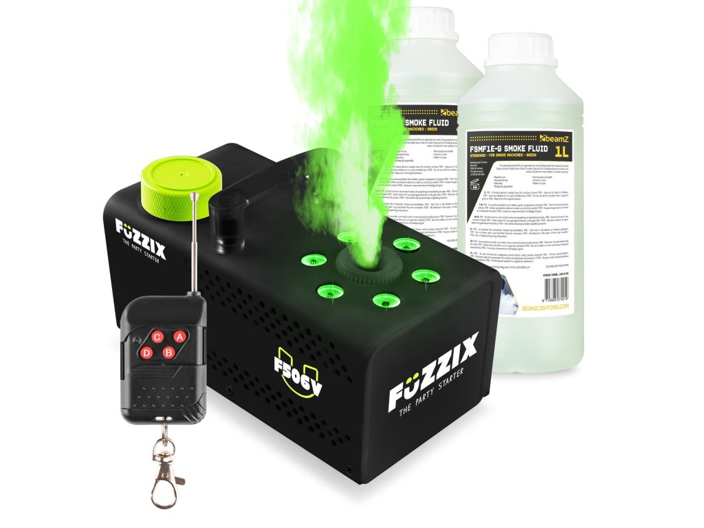 Výhodný set plastového vertikálneho výrobníka hmly s LED podsvietením a bezdrôtovým diaľkovým ovládaním Fuzzix F506V 6 LED RGB 500W a 2ks náplne do výrobníka štandardnej hustoty BeamZ FSMF1E-G 1L.