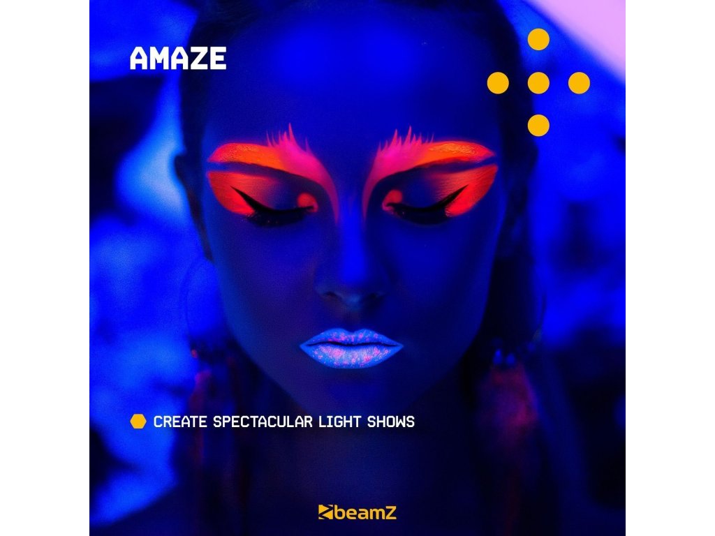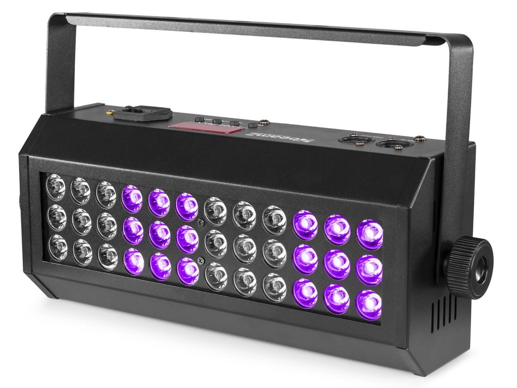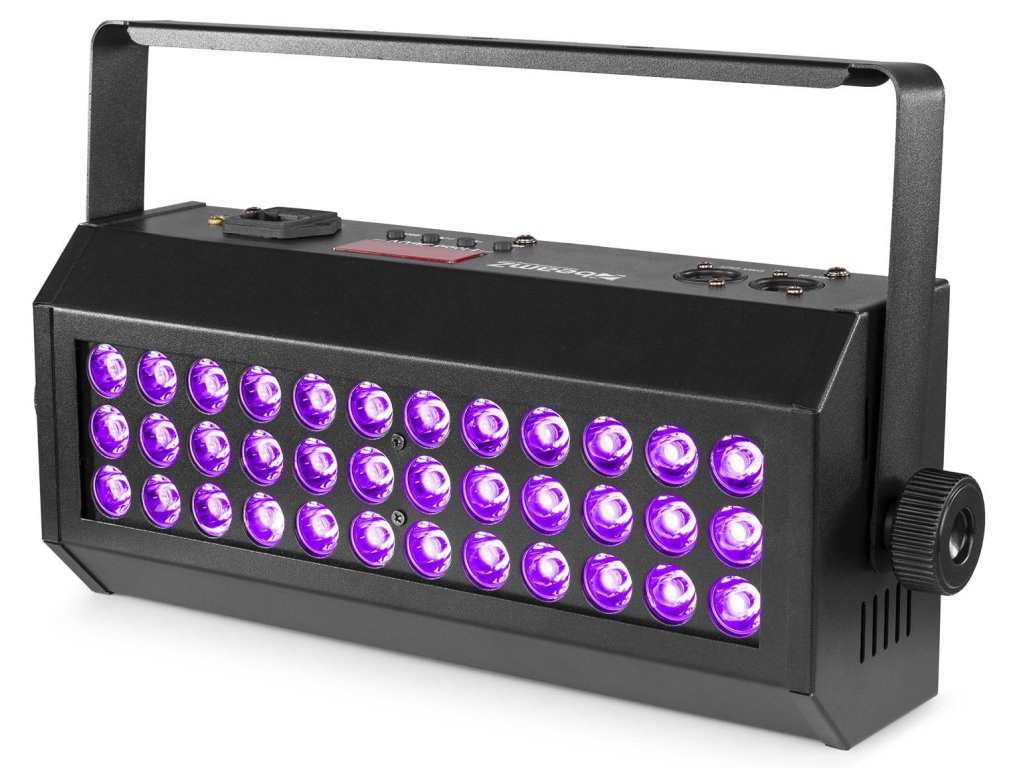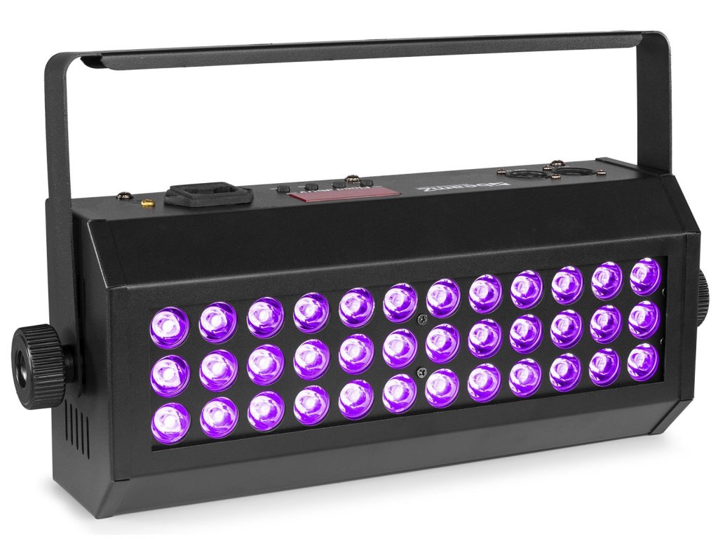 Výkonný UV svetelný efekt s 36 x 3W UV LED. Možnosť ovládania po sekciách (4 sekcie) pre pokročilé kreatívne možnosti. Integrovaná stroboskopická funkcia pre dynamické efekty. Flexibilné ovládanie: Samostatný režim, DMX ovládanie (4 alebo 8 kanálov) a Master/Slave synchronizácia. Reakcia na zvuk (Sound-to-Light) alebo automatické programy pre jednoduché použitie. Robustná konštrukcia s DMX vstupom/výstupom (3-pinový XLR) a IEC napájacím konektorom. Obsahuje kovový držiak pre jednoduchú montáž.