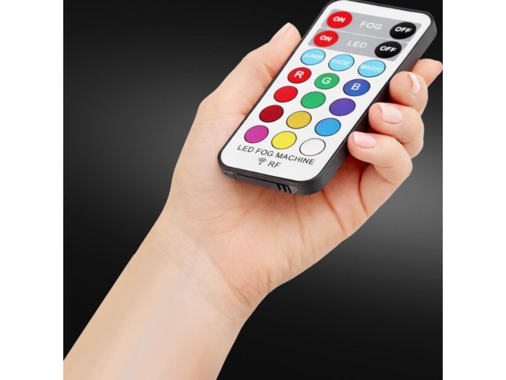 Použité 8x1W RGB LED 3v1 efektívne presvetľujú hmlu a dodávajú jej intenzívne farby, zatiaľ čo integrovaná LED diskogula s diódami 6x3W generuje viacfarebné lúče po celej miestnosti. Vďaka dosahu emisie až cca 2 metre a nepretržitému vypúšťaniu hmly trvajúcemu cca 15–20 sekúnd získate viditeľný, hustý scénický efekt, ktorý zvýrazní svetlá a lasery. Je to ideálne riešenie pre banketové sály, fitness kluby, školské diskotéky alebo domáce nahrávacie štúdiá.