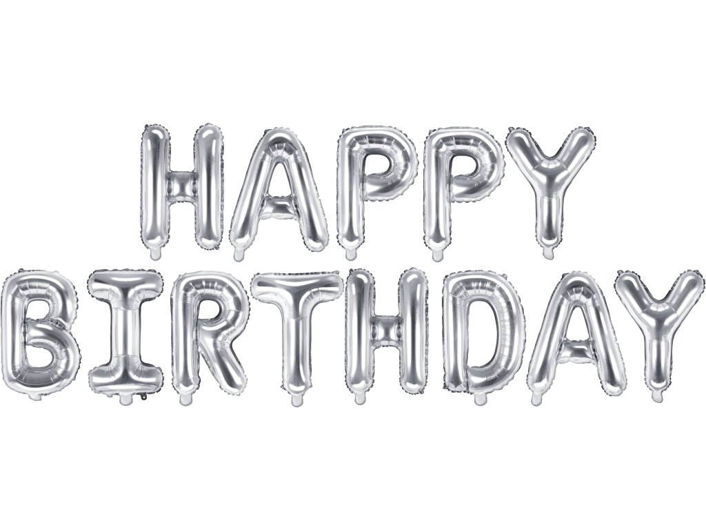 Metalický fóliový balón Happy Birthday, strieborný, veľkosť cca 340 x 35 cm.