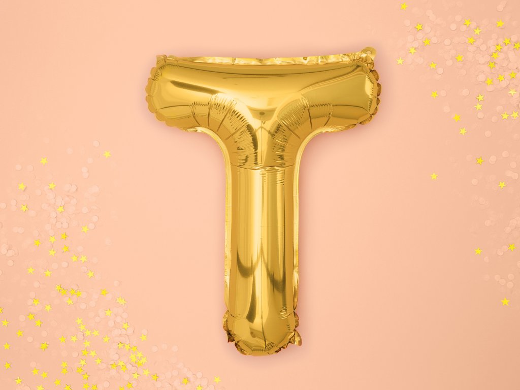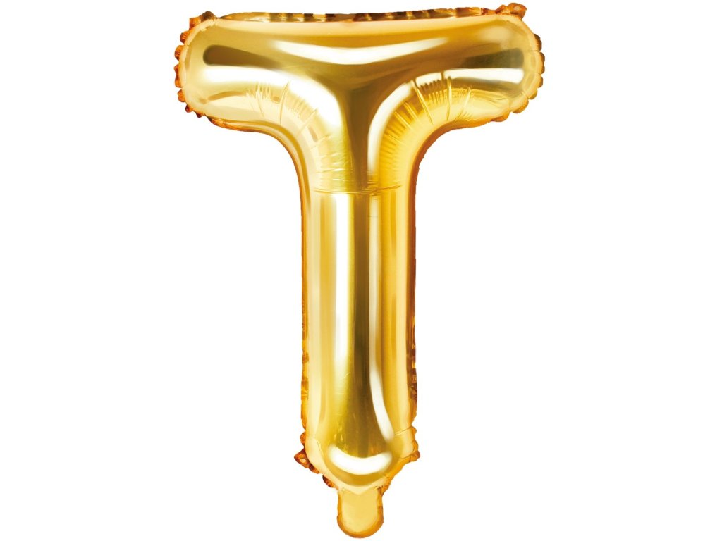 Metalický fóliový balónik písmeno ''T'', zlatý, veľkosť pred nafúknutím cca 40 cm, výška cca 35 cm. Nafúknite vzduchom.Dodatočné parametre