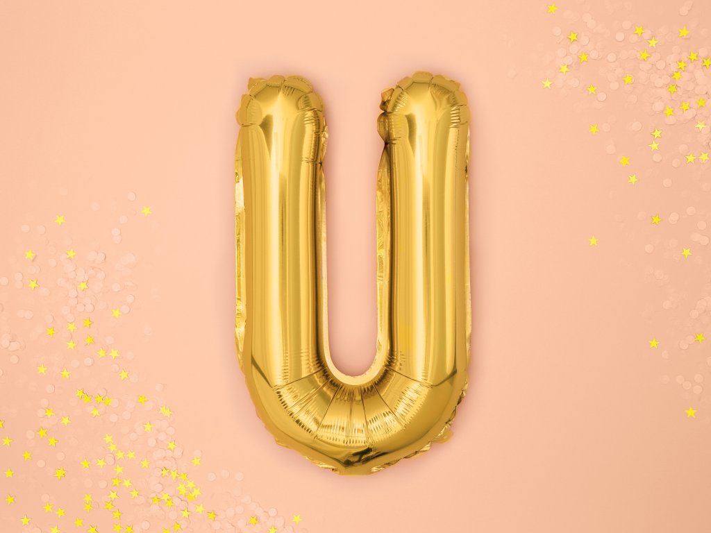 Metalický fóliový balónik písmeno ''U'', zlatý, veľkosť pred nafúknutím cca 40 cm, výška cca 35 cm. Nafúknite vzduchom.Dodatočné parametre